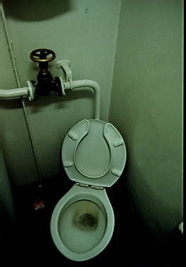 主筆が乗艦した「山雪」(云うまでもないが「やまゆき」が正しい)の士官用便所の勇姿。画面に見えるバルブで出したモノを流す構造である。