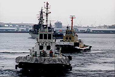艦体に傷を付けぬよう、タイヤ(と云うのだろうか)に白布を付けた曳航船 天城の勇姿。後方は博多。