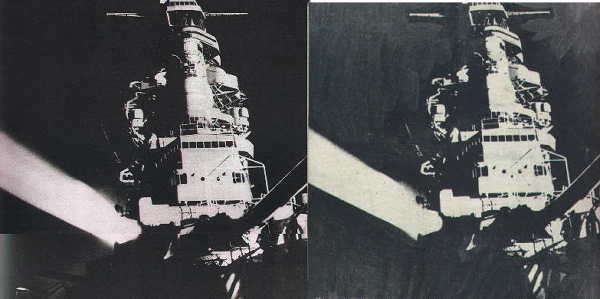 とあるから、A4版程度には引き伸ばされていたのだろう。「画報戦記」の写真を見る限りだと、昼を夜にする程度の修正は、エアブラシでは無く、筆でスミを塗ったように見える。艦の輪郭部分のスミが濃いので、まずそこから丹念に塗りつぶし、あとはエイヤっとベタ塗りをしたようである。