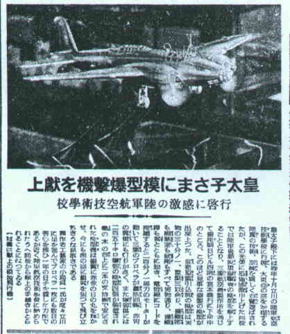 記事の内容は、読んでいただければわかるとは思うが、皇太子殿下すなわち今上天皇が、陸軍航空技術学校をおとずれた記念として、航空技術学校>三菱航空機>宮本商行>小島貞一と云うルートで模型が発注され、一年の製作期間を経て目出度く完成した、と云う記事である。「献上」と見出しにあるが、宮内省(当時)が本当に受け取ったかまではわからない(笑)。