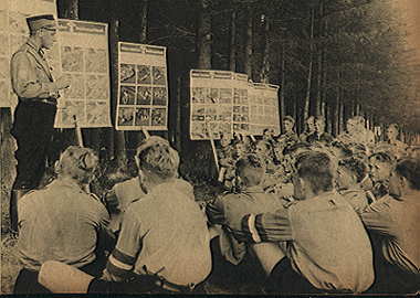 (前略)わが少年団代表60名が先頭をきり、ヒットラー・ユーゲントがこれにつづき、最期が青年団代表200名。シュルツェ団長以下菅笠に着ゴザ、金剛杖の純日本式のいでたち。日本人の二倍もあろう大コンパスで、「ハイル・ハイル」ととなえながら登って行く。