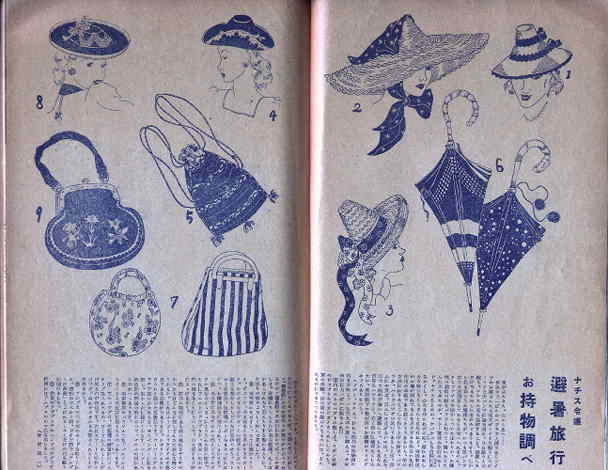 そこでナチスの国からついたばかりの、お嬢様の雑誌の封をパラッと切って、開いたとたんに出て来たのが、ナント夏休み旅行のモード。ナチスおとめの、ケバケバしき白粉に肌(はだえ)を隠し、心なき浮かれ女の如(ごと)、眉ひそめしむる粧いをこらさんとは思わねど、西洋料理のお箸が倒れてもふき出さざるを得ない生理作用の年齢である彼女たちであるから、美の女神に祈りをこらして作り上げた帽子、パラソル、ハンドバッグの流行であることは、言うにゃ及ぶ。言うには及ばないのは、これを以て軽佻浮華から避難して、しかもあなた自身をハツラツと、若く健かに颯爽たらしめたい、長期戦下の我が国のお嬢様のマメジビキでもありましょう。