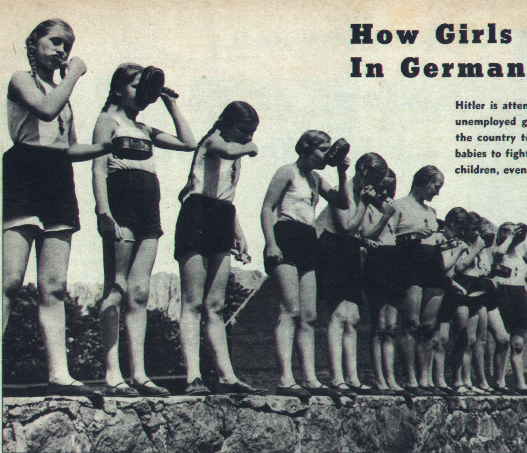 ナチスドイツ下の青少年活動と云えば、「ヒットラーユーゲント」(略して『HJ』、模型雑誌『ホビージャパン』とは関係ない)が有名である。女性については、10歳から21歳まで、B・D・M(ブント・ドイツェル・メーデル、『独逸女子青年団』、『独逸処女団隊』、『ドイツ少女同盟』、『ドイツ少女連盟』など手持ちの本だけでこんなに訳語がある)に所属して、ナチス女性としての教育を受ける。昭和15年刊「ナチス女性の生活」(アン・マリー・キーファー、生活社)では