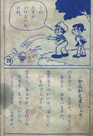 魔法の玉を池に投げ込んでしまうのである。これを使って悪さを働かないところが、さすがは学習雑誌の附録である。学習雑誌なので、ちゃんと読者にモノを考えさせる設問もある。皆さんも考えてみましょう。