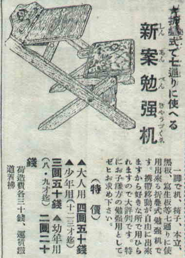 一脚で机、椅子、本立、黒板、写生板等七通りに使用出来る折畳式勉強机です。携帯移動が自由に出来ますから好きな所で用いられますので大評判です。特にお子様方の勉強用としてゼヒお求め下さい。