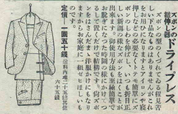 そう云う極めて個人的事情をご理解いただいた上で、この広告を見ると「ゼヒ」と云う気持ちになってくる(きませんか?)。図を見る限り構造は単純で、二枚の板の間にズボンをはさみ、紐かバネかわからないが、締め付けて圧力をかけているだけのようだ。ズボン吊り用クリップのついたハンガー一つあれば、自分でこしらえることも出来るだろう。