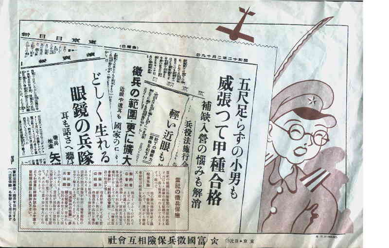 と、兵隊さんになれる人の範囲が広がって、フニャフニャした線の可愛い兵隊サンが喜んでいる。と云うことは、今までは「チビとメガネはダメだった」ことになり、松本零士のマンガに云うところの「メガネでガニマタの日本兵」は、この改正で発生したものといえるわけだ。