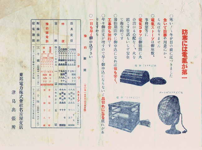 と云う内容である。「予約期間中に(略)工事費も無料です」と、下手に出ているようで「年々御注文が増すので(略)品切れになる」と微妙に脅かしているところが、味わい深い文章である。炭火と違い、火は消えない火起こしの手間も無い、有毒ガスも出ないと云う、電気暖房器機の売り文句は不変であることも伺える。「安全」だからと点けっぱなしでも大丈夫、なんて早合点してはいけませんよ。
