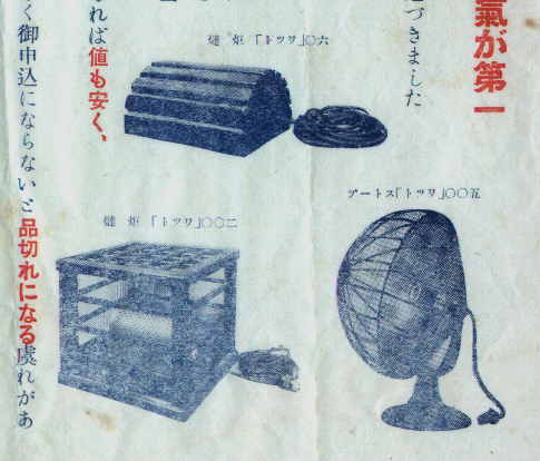 この広告に掲載されているのは、反射(輻射)型電気ストーブと、電気コタツである。写真を見るとコタツは熱源だけのもので、卓は別途用意しなければならない(今のコタツがいかに良く出来たものかがわかる。しかしコタツの『本体』って、どっちなんでしょうね)。