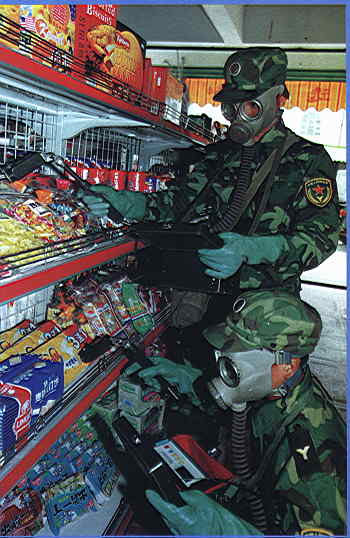 <また>ガスマスクである(笑)。これは「解放軍画報」(2001.7)と云う雑誌に掲載された、防疫部隊の活動を紹介した記事にあった一枚である。中国も、さすがに爆心地に騎兵隊を投入するより、市民の安全確保の方が重要である、と真っ当な道を歩き出したようである(笑)。しかし耳は大丈夫なのか?