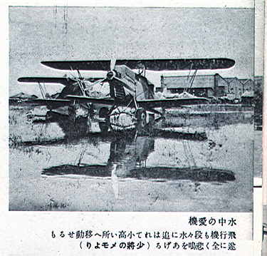 <水中の愛機>と題された作品。<飛行機も段々水に追はれて小高い所へ移動せるも遂に全く悲鳴をあげる>とある。水に映る飛行機をも写そうとした、撮影者の意図が感じられる写真である。