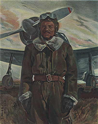 死後描かれたと思われる肖像。<2602年>とあるから昭和17年の作である。タイトルは<在りし日の軍神>、描いた人は田中貞一。有名な写真を元にして描かれている。写真の背景は九五式戦闘機なのであるが、画では<隼>になっているところがミソである。