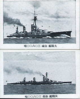 こちらは<大戦艦 伊勢、日向>の勇姿。学研「伊勢型戦艦」を見ているのだが、前部マスト附近の形状から、これも大正末期頃の撮影と推察される。