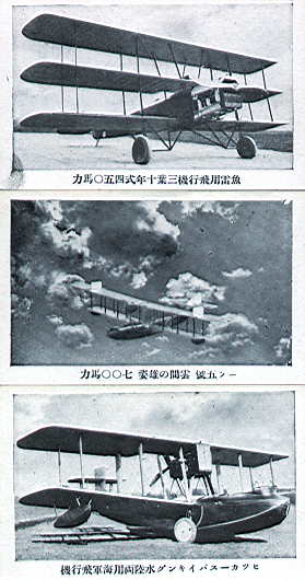 上から<魚雷用飛行機三葉十年式>、真ん中は文字が読めないので書かない、下が<ビッカースバイキング水陸両用海軍飛行機>と云う、これまた今時誰も知らないような飛行機達である。なんにせよ、もっと別な飛行機があるだろう、と云いたくなる取り合わせである。