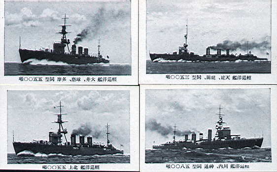 軽巡洋艦達。正直なところ模型映えのしない地味な艦であるが(ファンの方々、ゴメンナサイ)、上の<巡洋艦>に比べると、さすがに速そうに見える。左上が<軽巡洋艦 大井、球磨、多摩 同型>、その右は<天龍、龍田 同型>、左下は<軽巡洋艦 北上>、右が<軽巡洋艦 川内、神通 同型>である。