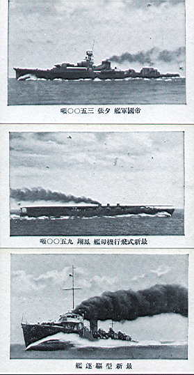 このカードが発売されていた時期であるが、軍艦の写真から考えると、大正13〜15頃と云う事になるのだが、なにせこのカードには、おなじみの重巡洋艦がまったく登場しないのである。そのあたりの事情を勘案して、大正末〜昭和初と推測してみる。しかし<最新!>と謳っておきながら、中身を見ると一世代前、と云うのは良くある話であるから、断言はまったく出来ない。