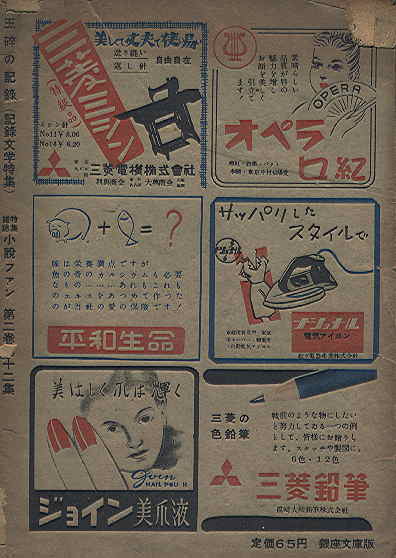 電気アイロン、口紅、ミシンにマニキュア(美爪液とは凄いネーミングだ)!こう云う広告を見ると「戦争は終わったんだな」とつくづく思うのである(小野田サンはその後20年くらい戦争を続けるのだが)。