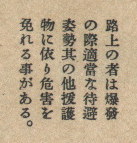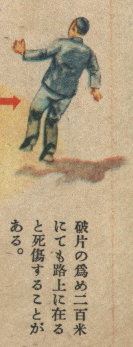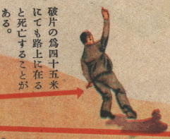 これを読めば、空襲の最中に路上で野次馬をしているのが、いかに危険であるかが理解できると云うものである。当然、爆弾で破壊されたガラス等の物体も飛散するわけであるから、身を隠すことがいかに重要かがわかる。