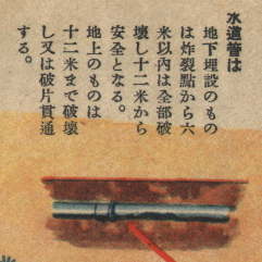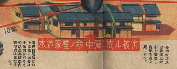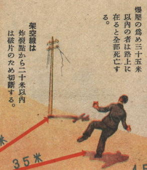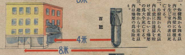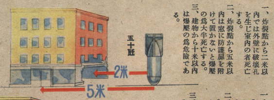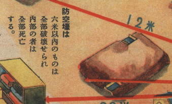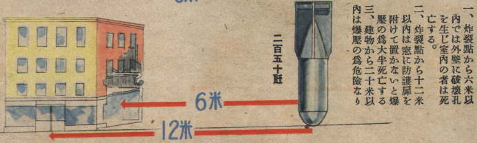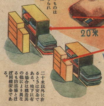 昭和17年11月に大日本防空協会から刊行された「防空絵とき」は、民防空の心得を説いた本であるが、ここに「破壊用爆弾の効力」と云う図版がある。爆弾が一発落ちても、このような条件下であれば安全だ(つまり、この範囲にいると危ないと云うこと)、と図示したものである。