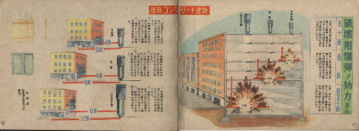 さて、今まで紹介した部分は、木造家屋と屋外の人に対する爆弾の効力であったが、コンクリート建築物に対する効力(ウラを返せば被害)を表したのが、以下の図版である。