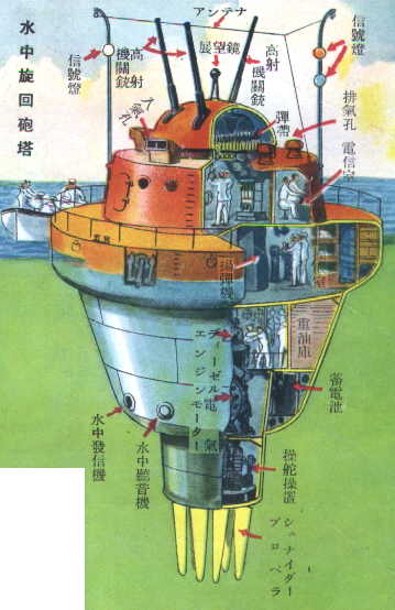 今度の欧州大戦で、数万噸の鋼鉄の軍艦が空中からのたった一個の爆弾に抗しがたく、もろくも撃沈させられたということが伝えられいる。質に於ても量に於ても何千分の一にもすぎない小さな飛行機が巨大な軍艦の最大の恐怖であるとしたならば、軍艦も商船も従来のような防御方法だけでは安心していられない。ここに着想されたのがこの浮標式な水中旋回砲塔である。この旋回砲塔は数個の高射機関銃を装備し十名以内の少数の人員によって操作され、艦隊根拠地或は前進基地に艦船をめぐってその周囲に多数備えられる。シュナイダー・プロペラによって左右前後いずれの方向にも自由に操縦される。このシュナイダー・プロペラは電気モーターで操られるが、その原動力はディーゼル・エンジンによって蓄電池に貯えられた電力を用いる。電信室、展望鏡、水中聴音機、水中発信機等の通信設備は勿論備えられているし、錠を下して固定させて各砲塔間に潜水艦網を張って潜水艦の侵入を防ぐことも出来るようになっている。
