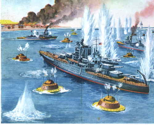 「水中旋回砲塔大活躍の図」である。軍艦のまわりは水柱、地上は炎上中では読者が眉に唾を付けても文句は云えぬ。それともこれがために爆弾の艦への直撃は免れていると云うことなのか? カットしてしまった図の上には煙を吹いた飛行機が描かれているから、「これで良いのだ」とこれ以上のツッコミはしない。