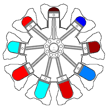 上の2つの気筒内の色は、水色が「吸気」工程、水色から紺色への変化が「圧縮」工程、赤が「爆発」工程、赤からこげ茶色への変化が「排気」工程です。一つの気筒のみに注目して見ていただくと解りやすいかと思います。
